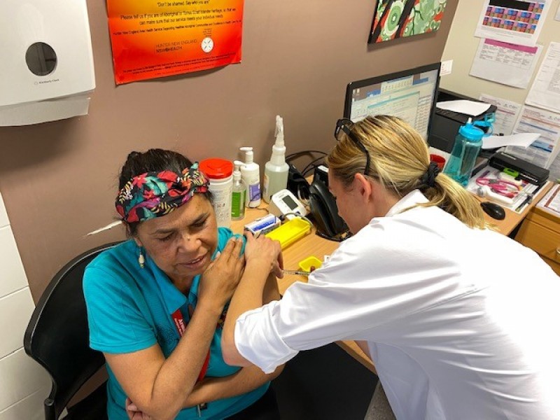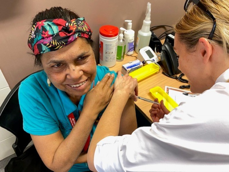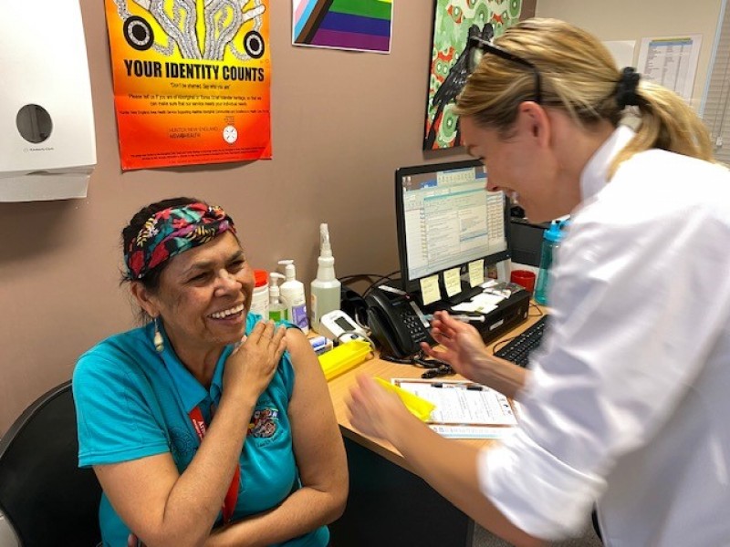 Armidale Armajun commenced it's COVID-19 vaccination rollout today, with Auntie Debbie Green leading the way putting her hand up to receive her 1st dose pictured with Dr Kate Martin as the administering Doctor.