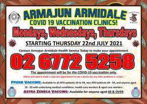 COVID 19 Vaccinations will be available at the Armajun Armidale Health Service starting from the 22nd July 2021 and will continue every Monday, Wednesday and Thursday with both vaccines available: